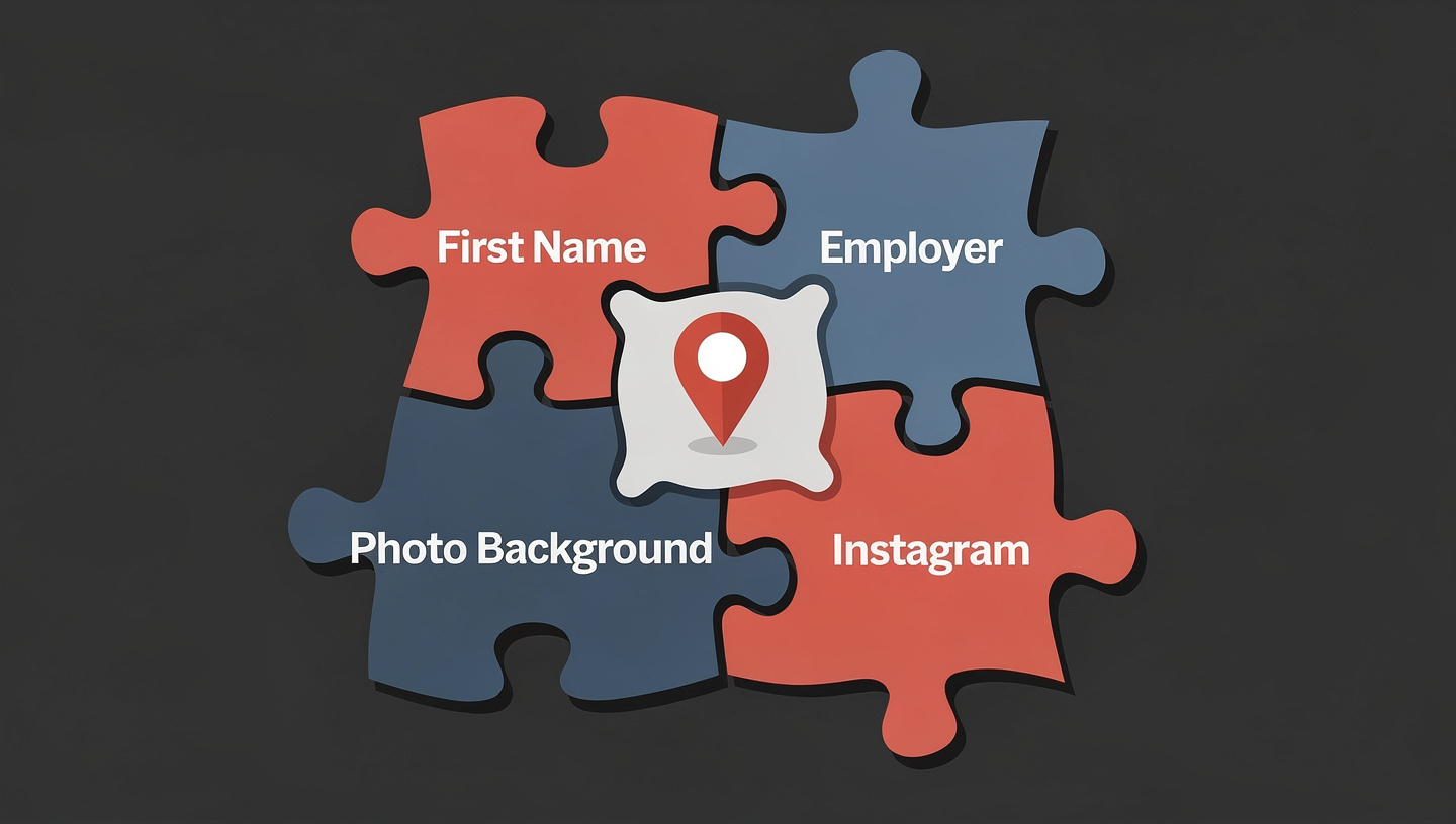 Photos with identifiable backgrounds Lifestyle and appearance Street signs, building logos, distinctive architecture = specific locations. Gym, coffee shop, apartment complex — your daily routine mapped.