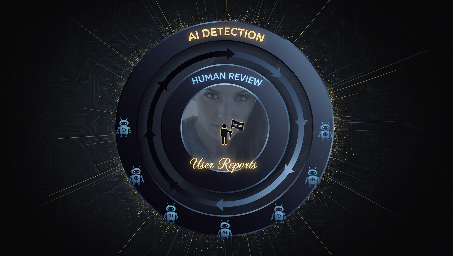 The three layers are interconnected: user reports train the AI models (reported fakes become training data), AI flags content for human review (automated triage), and human decisions refine the AI models (feedback loop). In theory, this creates an improving system. In practice, the system’s effectiveness is limited by the weakest layer — and each layer has significant blind spots.