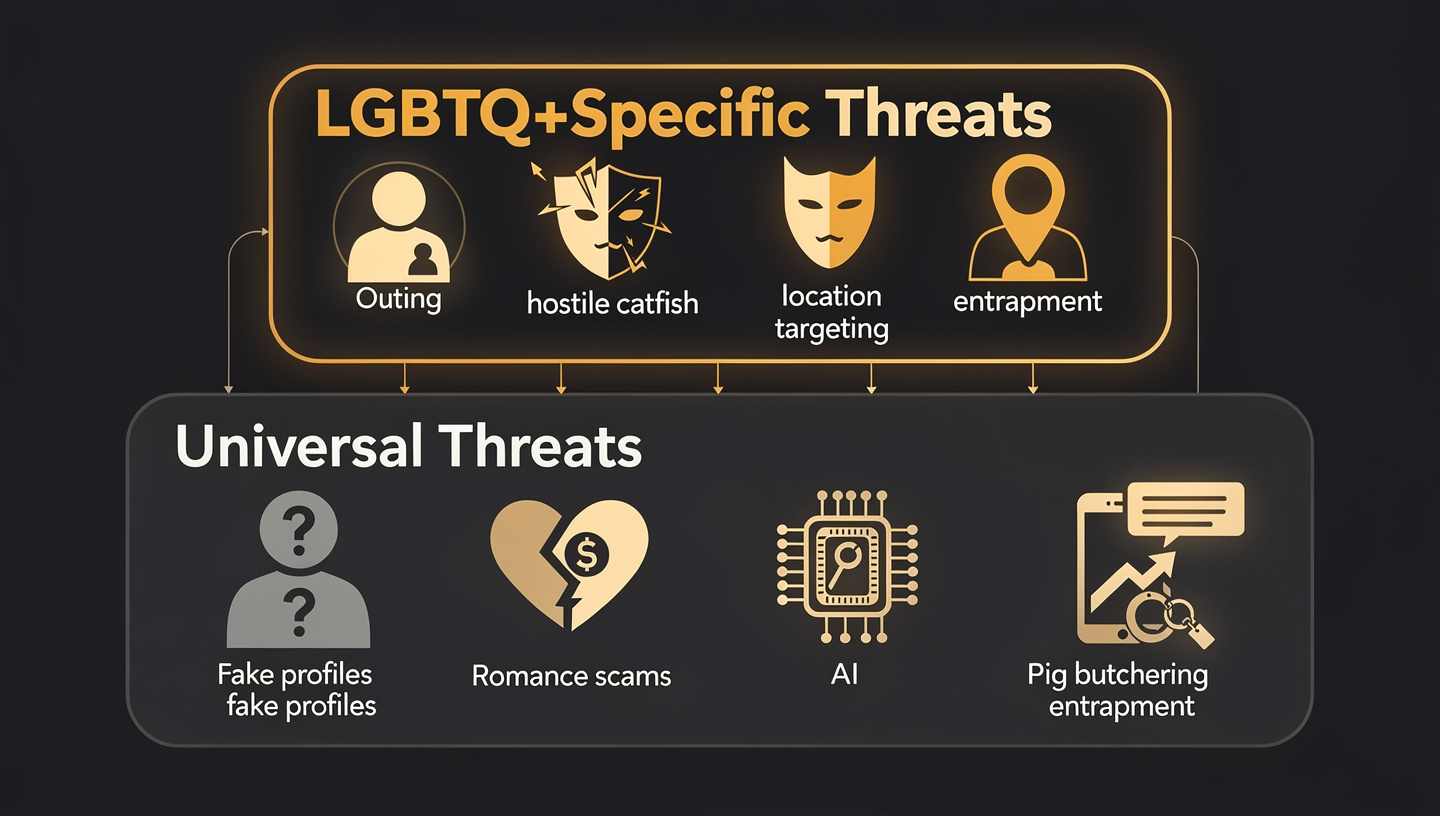 The dual threat layer means LGBTQ+ daters must apply both the universal safety framework (screening for scams, verifying identity) AND the LGBTQ+-specific protections (privacy measures, location safety, hostile-intent detection). Neither layer alone is sufficient.