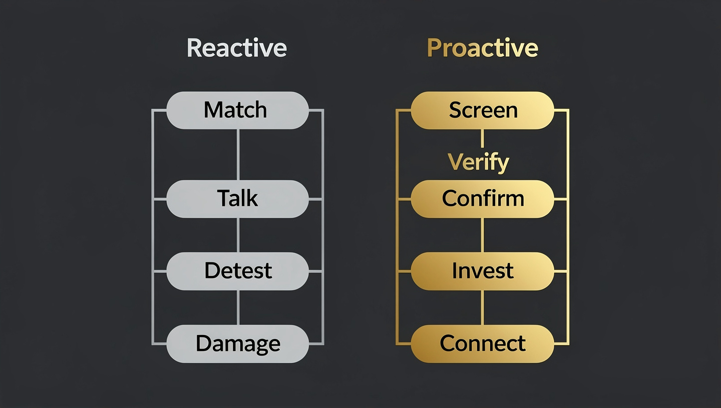 The reactive model follows a dangerous sequence: match first, then evaluate. In this model, you swipe right based on photos and a bio, begin conversations, develop emotional investment over days or weeks, and then — after you’re already attached — start looking for red flags. If you find them, you try to extricate yourself from a relationship that already has emotional hooks in you. If you don’t find them (or if you rationalize them away because you’re invested), the scam or manipulation continues.